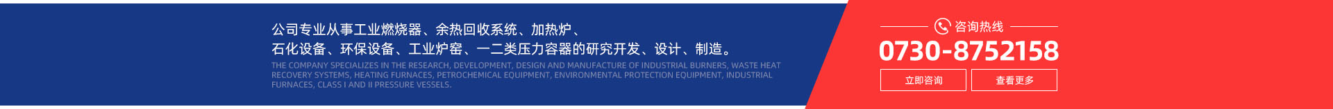 公司專業從事工業燃燒器及其智能化控制系統、余熱回收系統、加熱爐及各類爐配件、石化設備及配件、環保設備、工業爐窯及其輔助設備配件、一二類壓力容器的研究開發、設計、制造。